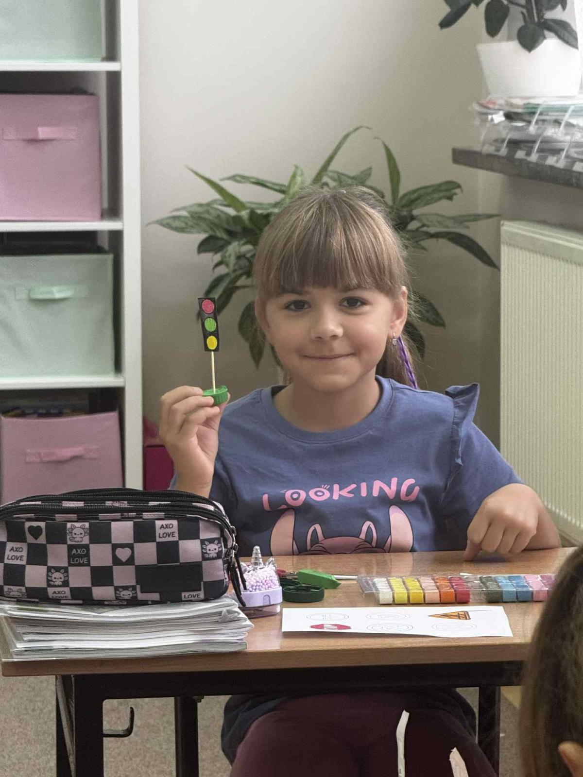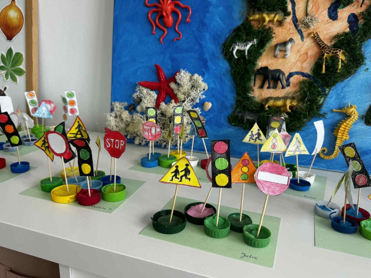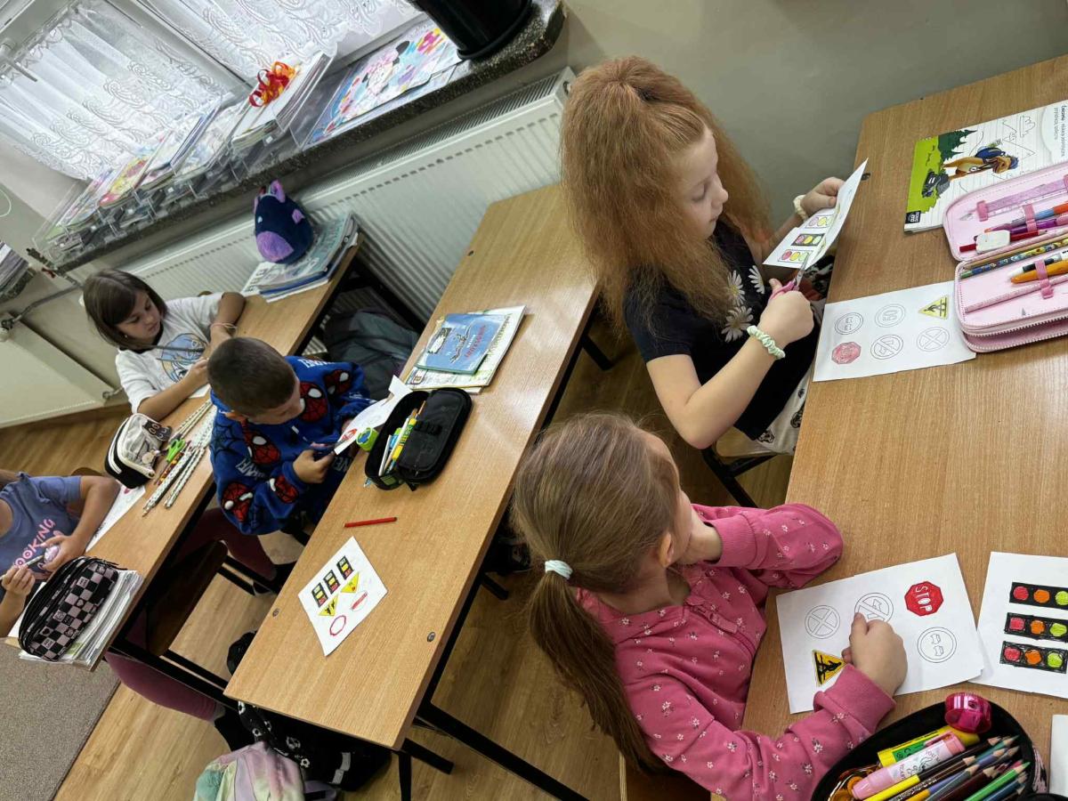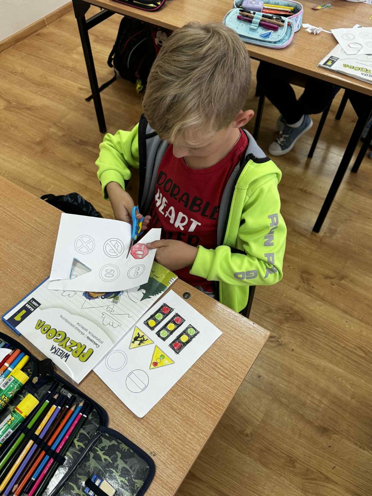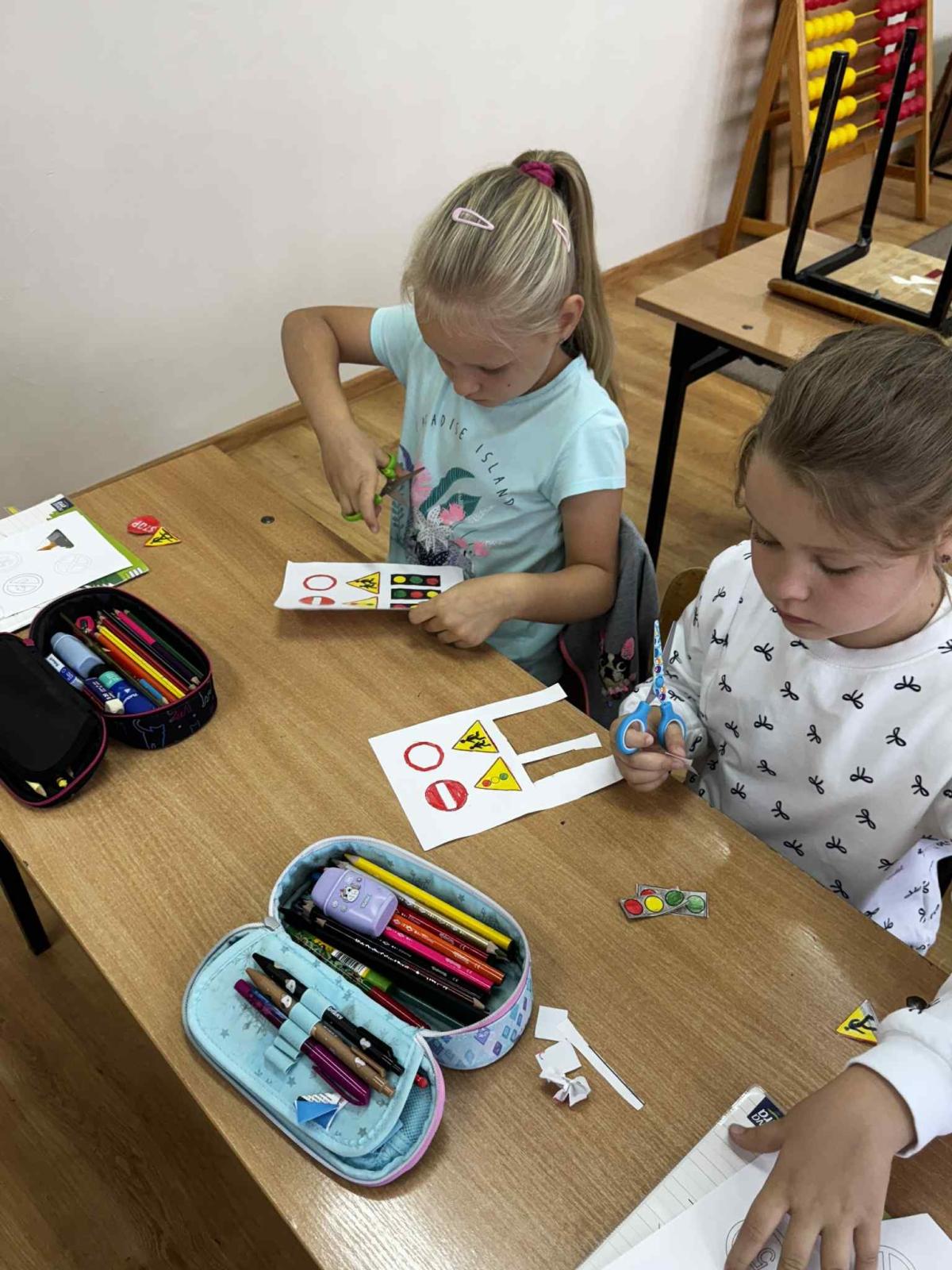 Nie zabrakło również zabaw edukacyjnych oraz działań praktycznych. Na lekcji techniki dzieci kolorowały i wycinały znaki drogowe, a następnie – wykorzystując plastelinę, nakrętki i wykałaczki – tworzyły własne modele znaków.