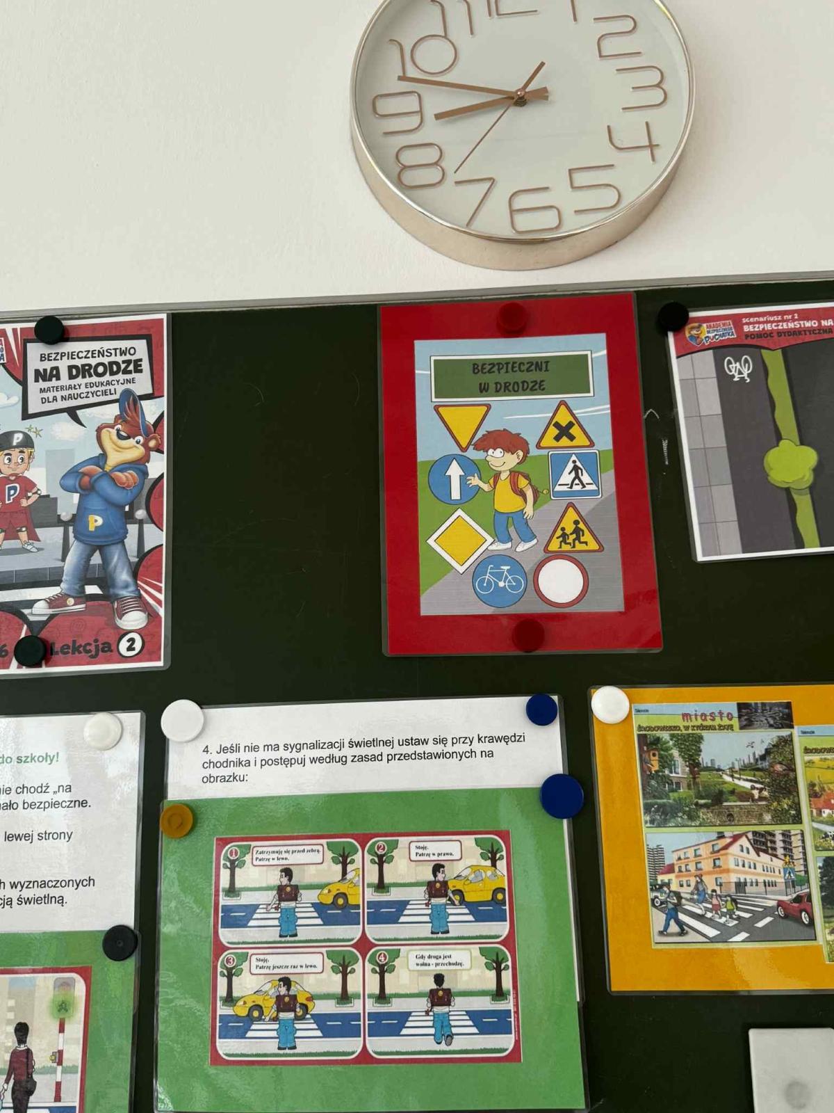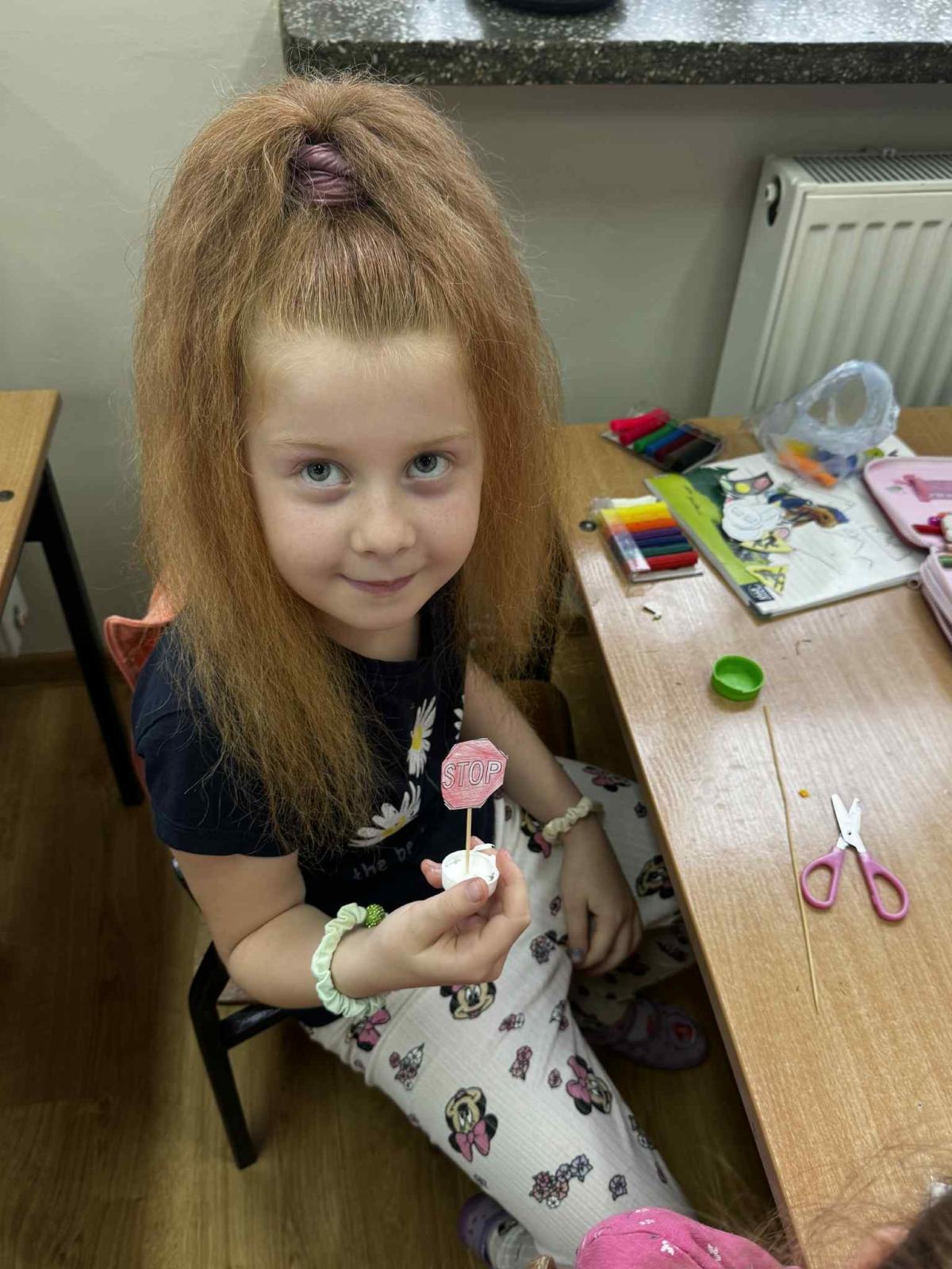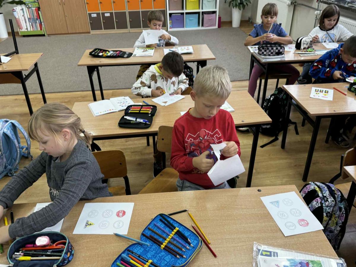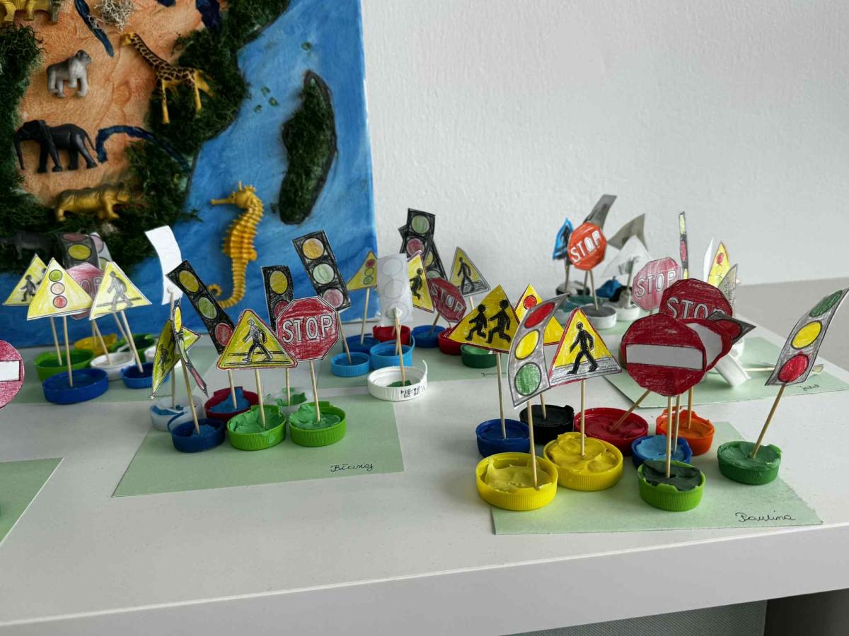 Nie zabrakło również zabaw edukacyjnych oraz działań praktycznych. Na lekcji techniki dzieci kolorowały i wycinały znaki drogowe, a następnie – wykorzystując plastelinę, nakrętki i wykałaczki – tworzyły własne modele znaków.