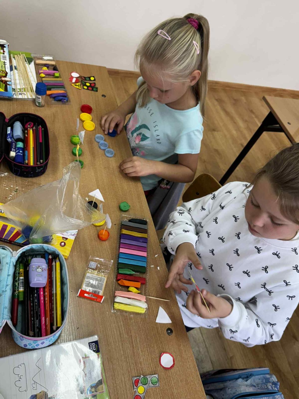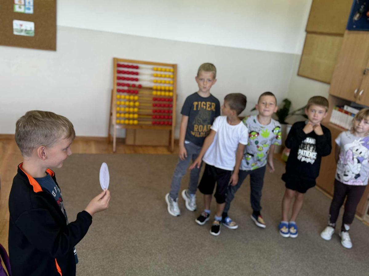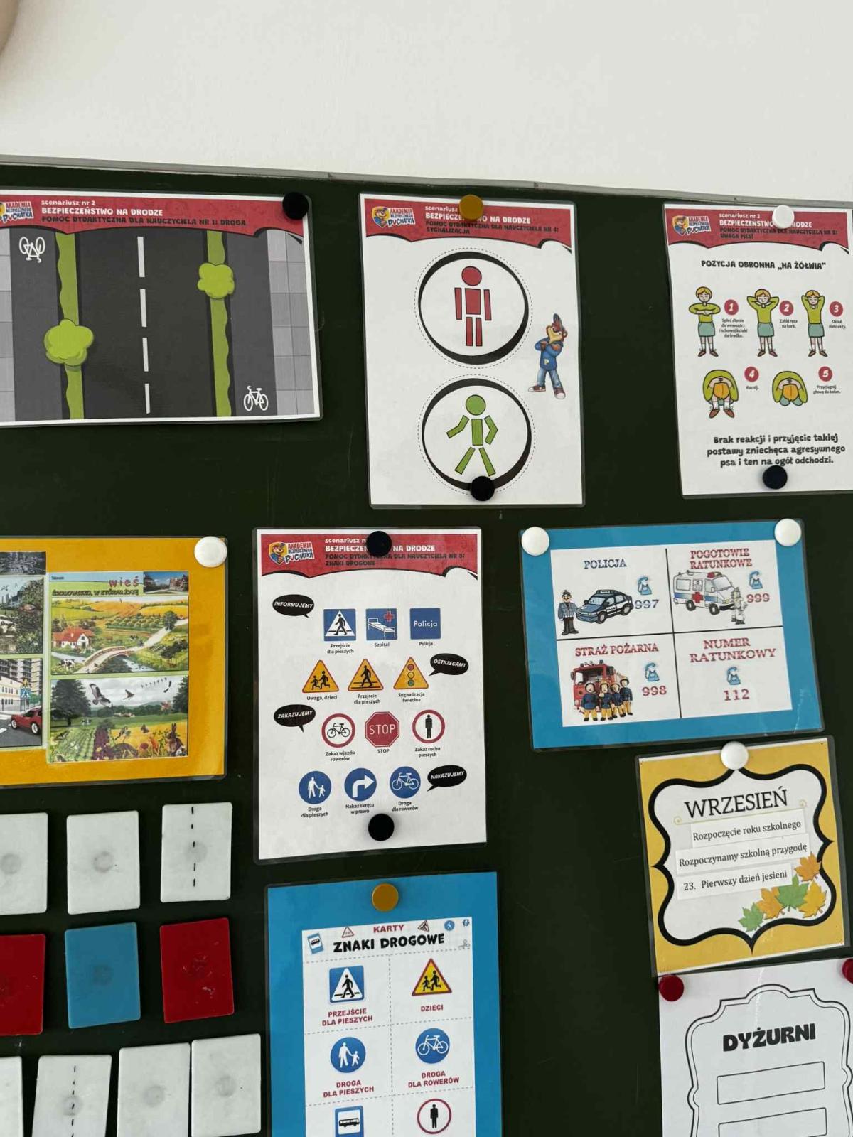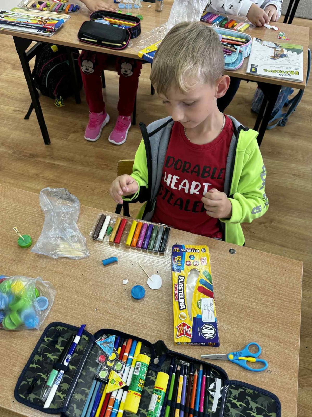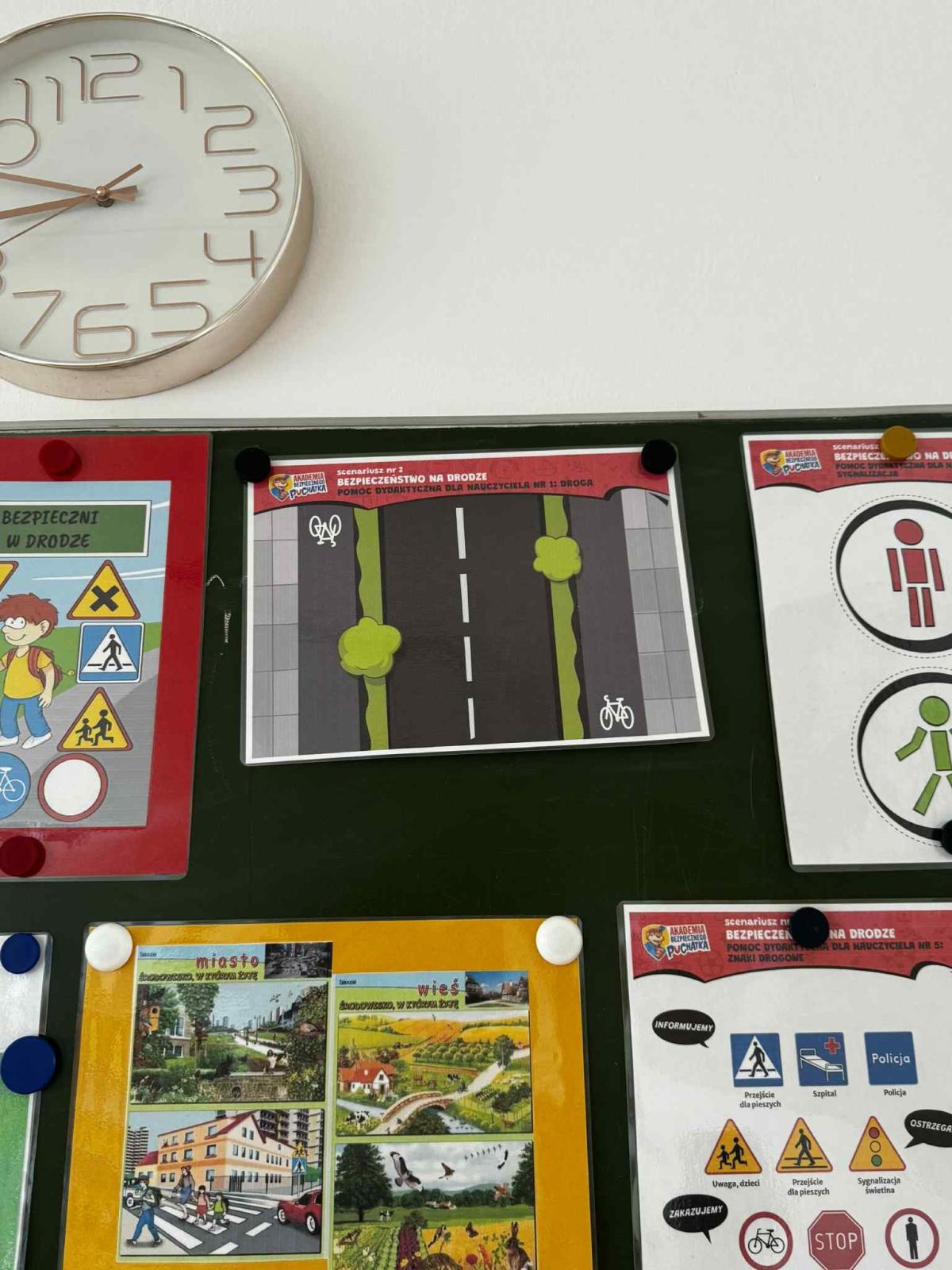 Nie zabrakło również zabaw edukacyjnych oraz działań praktycznych. Na lekcji techniki dzieci kolorowały i wycinały znaki drogowe, a następnie – wykorzystując plastelinę, nakrętki i wykałaczki – tworzyły własne modele znaków.