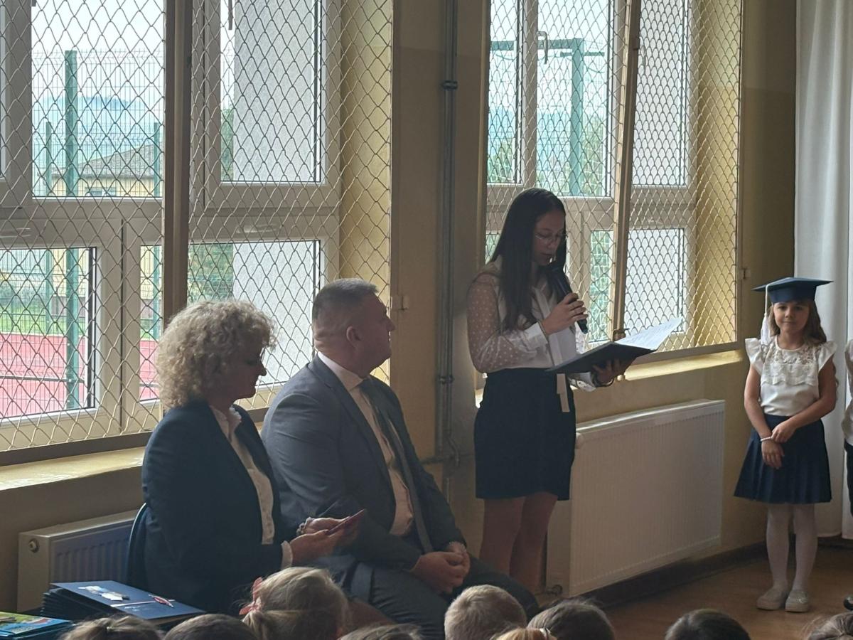 Do zebranych zwróciła się także pani Izabela Połomska-Maślanka, przedstawicielka Banku Spółdzielczego w Podegrodziu. W ciepłych słowach życzyła pierwszoklasistom wytrwałości, przyjaźni i wielu pięknych szkolnych wspomnień.