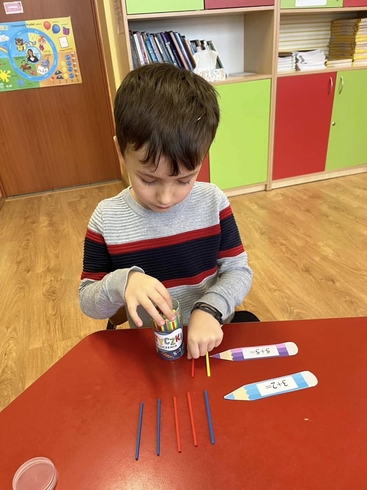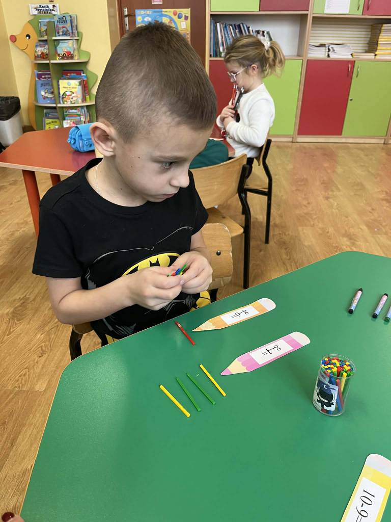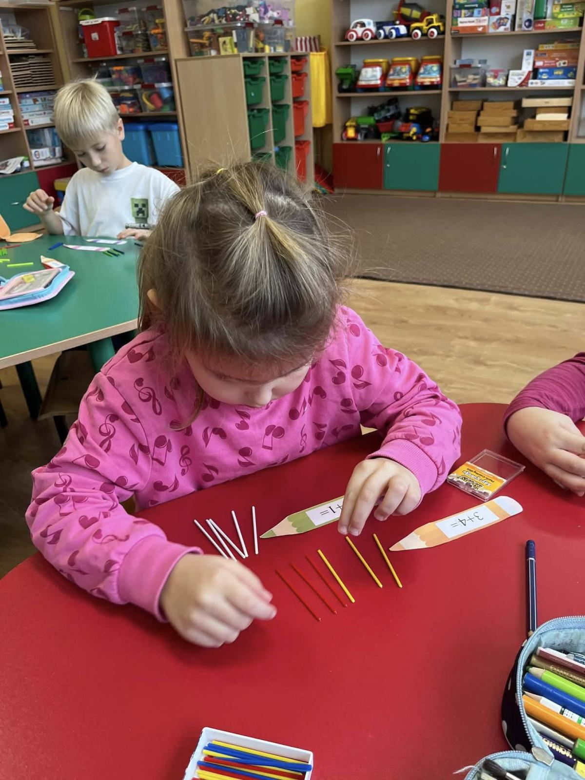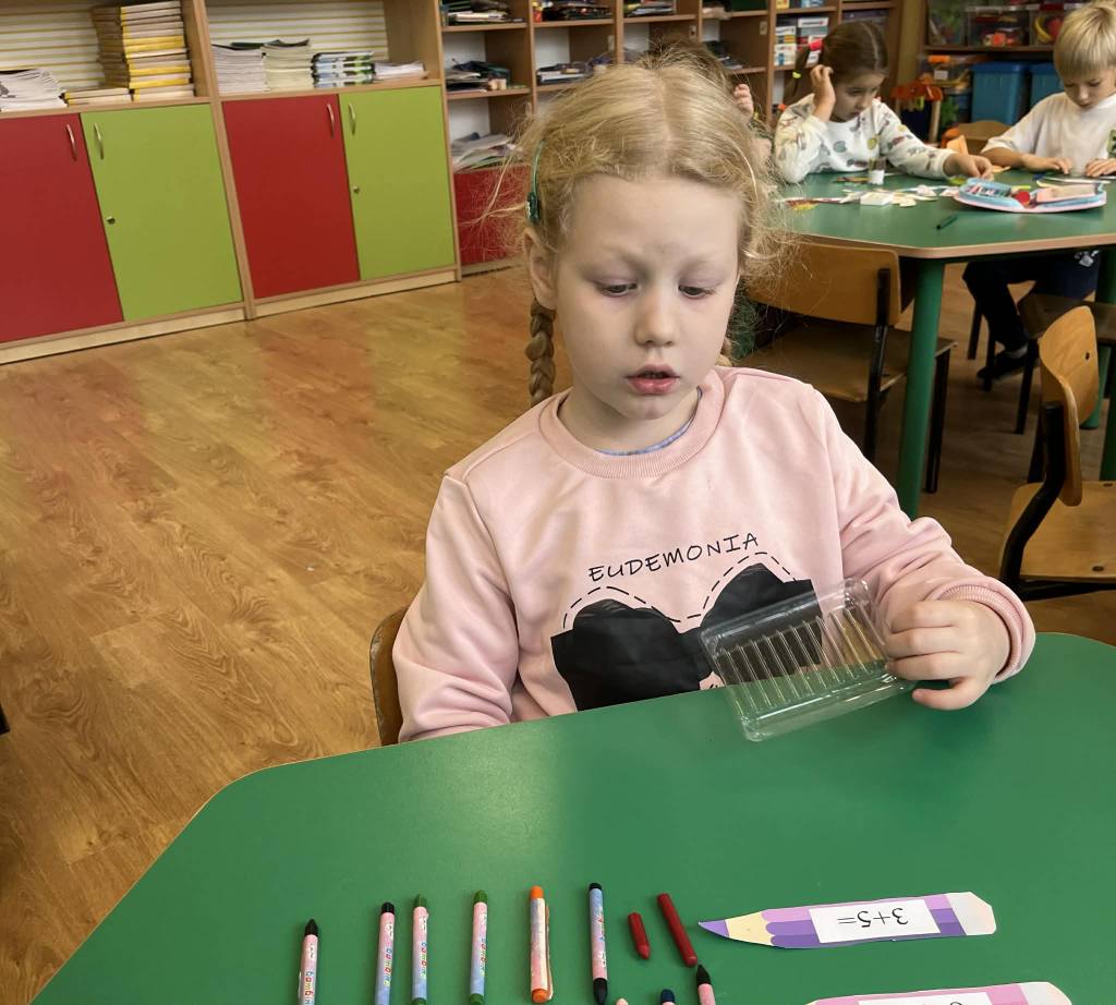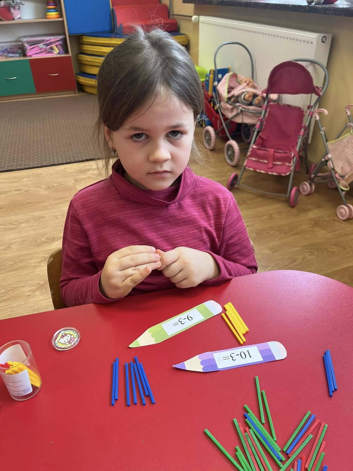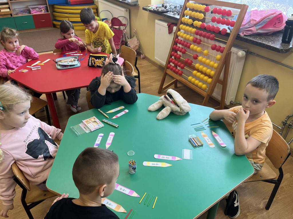 W części matematycznej każdy maluch otrzymał papierowe kredki z zadaniami do rozwiązania. Zadaniem dzieci było dopasowanie prawidłowych wyników, korzystając z kredek lub patyczków do liczenia. To prosty, a jednocześnie bardzo angażujący sposób na naukę przez zabawę.