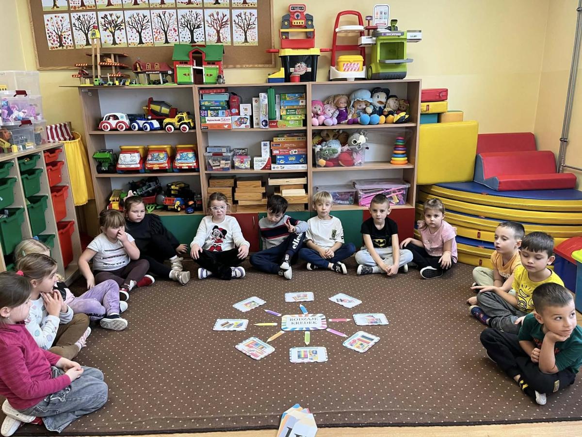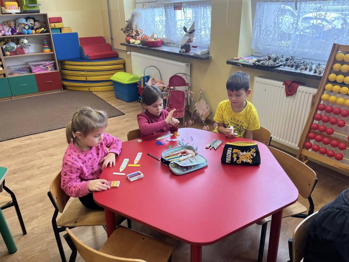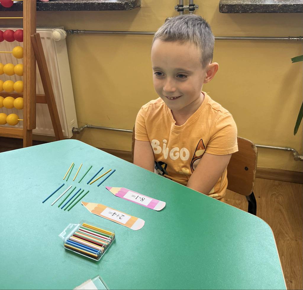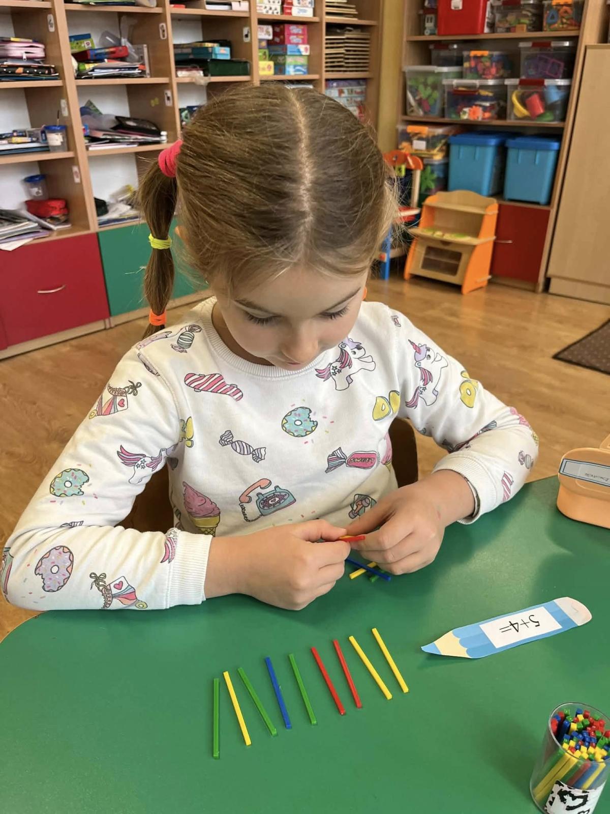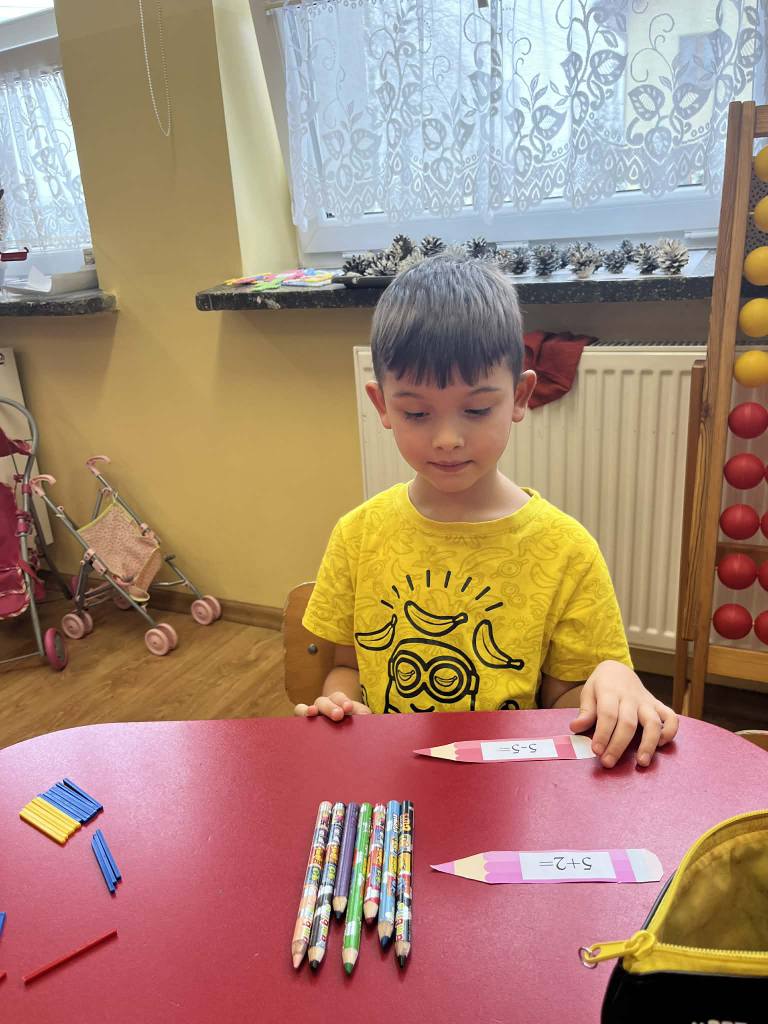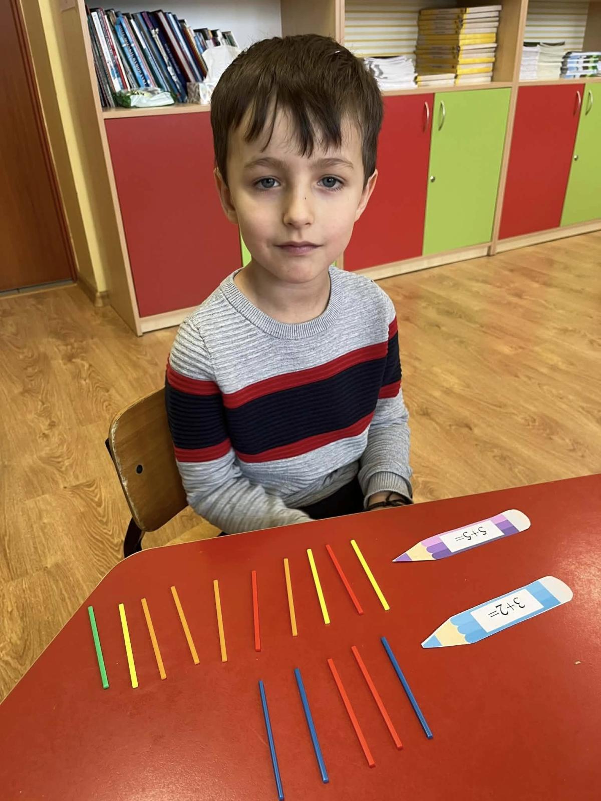 W części matematycznej każdy maluch otrzymał papierowe kredki z zadaniami do rozwiązania. Zadaniem dzieci było dopasowanie prawidłowych wyników, korzystając z kredek lub patyczków do liczenia. To prosty, a jednocześnie bardzo angażujący sposób na naukę przez zabawę.