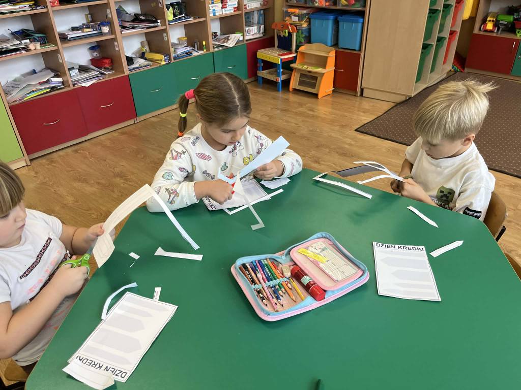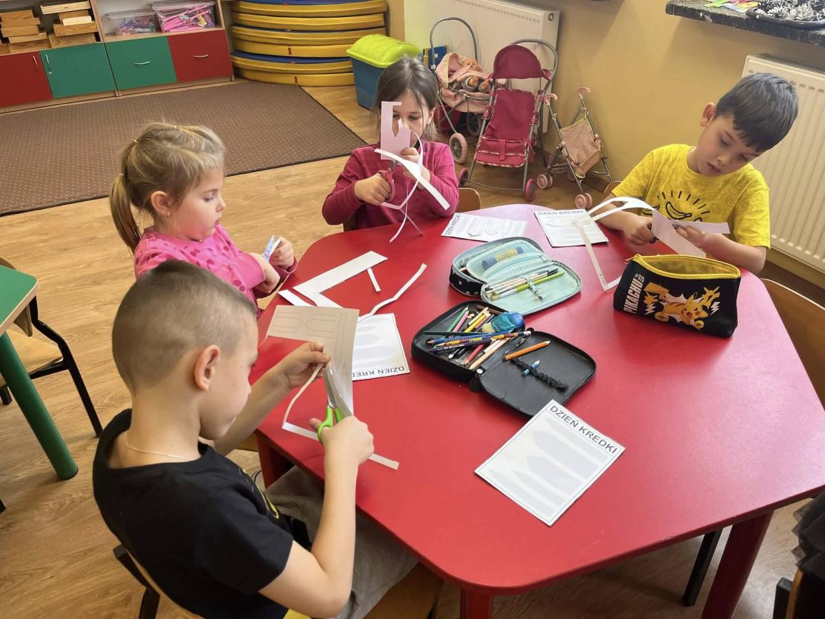 Później dzieci przystąpiły do twórczej pracy plastycznej – wycinały i przyklejały kolorowe kredki, co świetnie rozwijało sprawność manualną i precyzję ich małych rączek.
