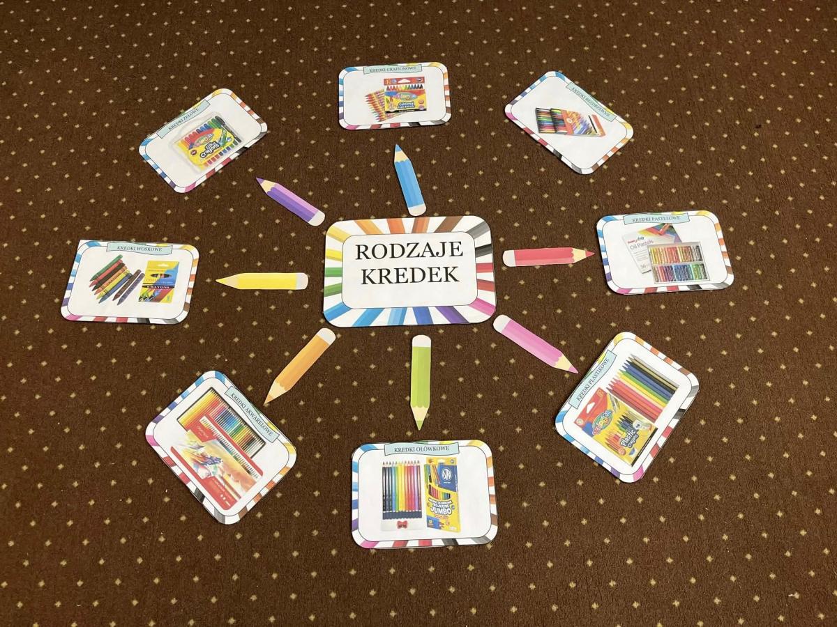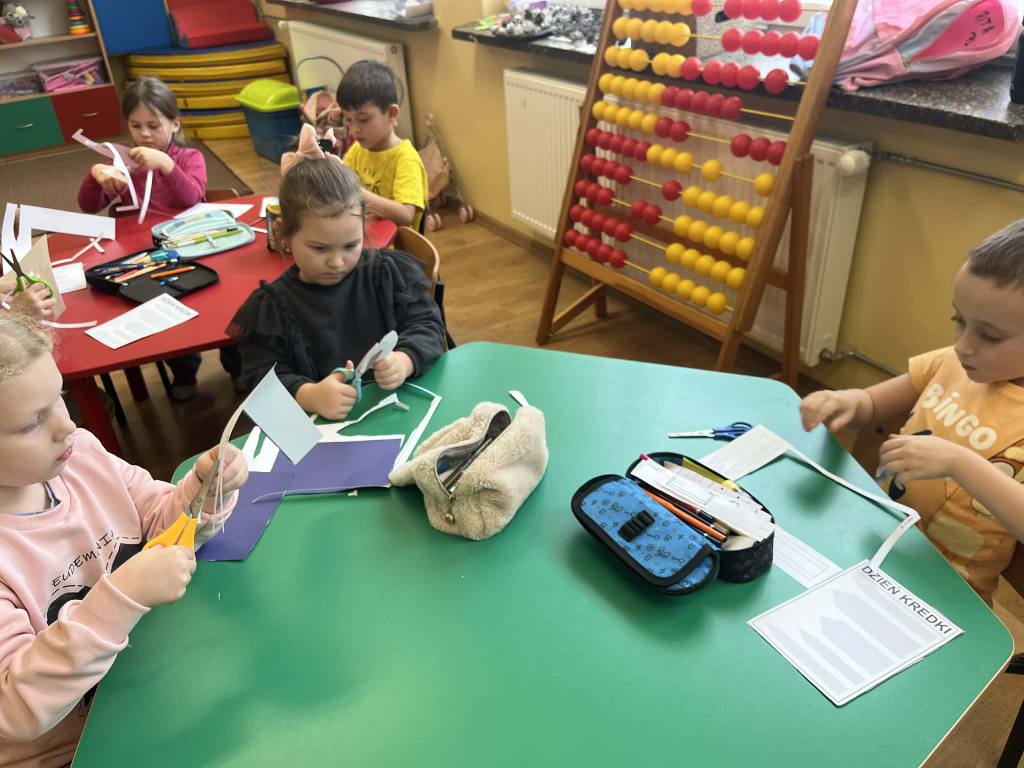 Dzień Kredki w oddziale przedszkolnym rozpoczął się od poznawania różnych rodzajów kredek – świecowych, ołówkowych, cienkich i grubych. Przedszkolaki z dużym zainteresowaniem obserwowały, jakie ślady pozostawia każda z nich.