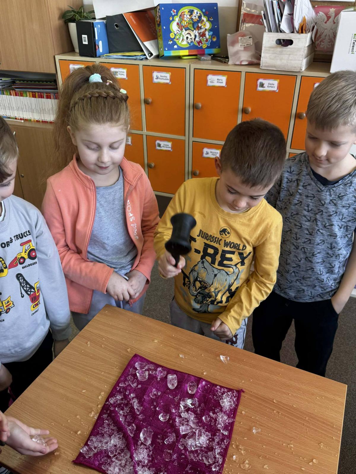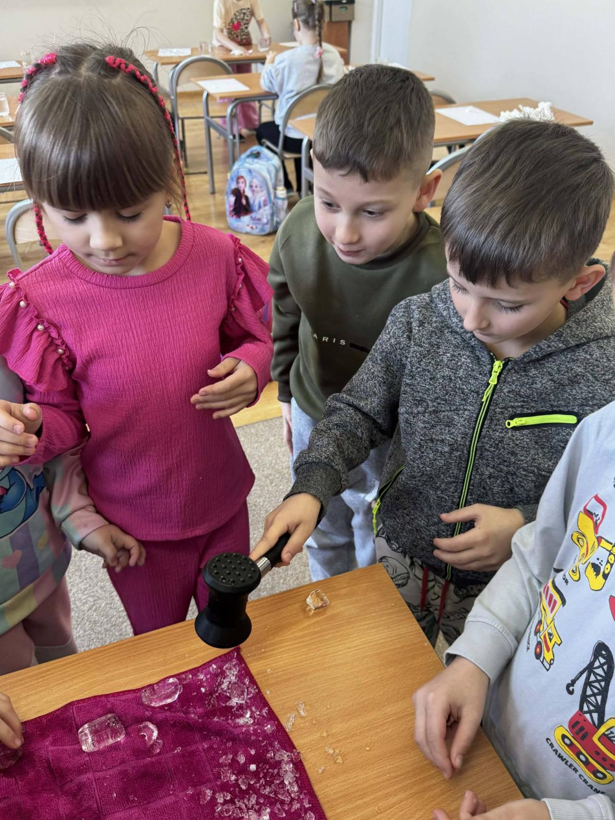 W części praktycznej uczniowie badali właściwości lodu, określali jego cechy oraz przekonali się, że mimo swojej twardości może być kruchy. Duże zainteresowanie wzbudziło doświadczenie z solą i nitką, podczas którego dzieci zaobserwowały, że sól obniża temperaturę topnienia lodu, powodując stopienie jego cienkiej warstwy. Po chwili woda ponownie zamarzała, co umożliwiło podniesienie kostki lodu za pomocą nitki.