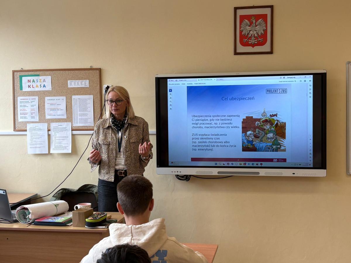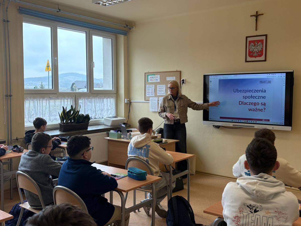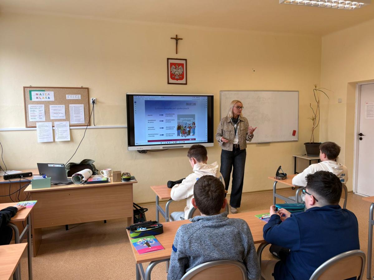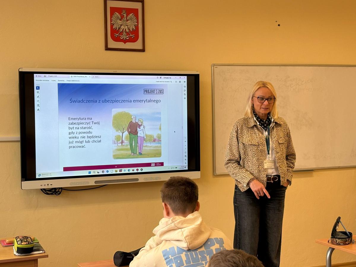 Uczniowie klasy VII wzięli udział w spotkaniu z przedstawicielem Zakładu Ubezpieczeń Społecznych, panią Anną Mieczkowską, w ramach projektu „Projekt z ZUS”. Projekt jest przeznaczony dla uczniów szkół podstawowych i ma na celu uświadomienie młodym ludziom, dlaczego warto podlegać ubezpieczeniom społecznym oraz na jakie świadczenia można liczyć przy regularnym opłacaniu składek. Podczas zajęć uczniowie poznali podstawy systemu ubezpieczeń społecznych oraz obowiązki i prawa ubezpieczonych, płatników i świadczeniobiorców.